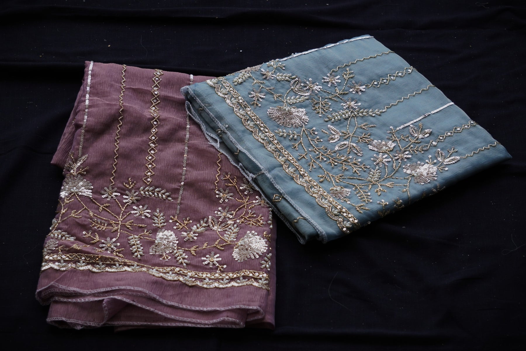 Rich golden zari and thread embroidery. Floral and leafy patterns across the fabric. Vertical embroidered stripes enhancing the length and design. Subtle sequin highlights for a touch of shimmer.