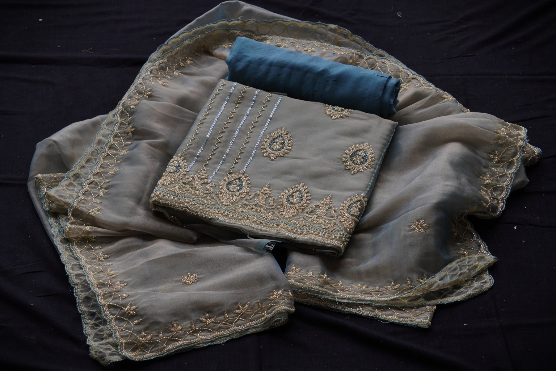 Design Placement: Dense embroidery at the bottom gradually fading upwards, giving a graceful and flowing effect.