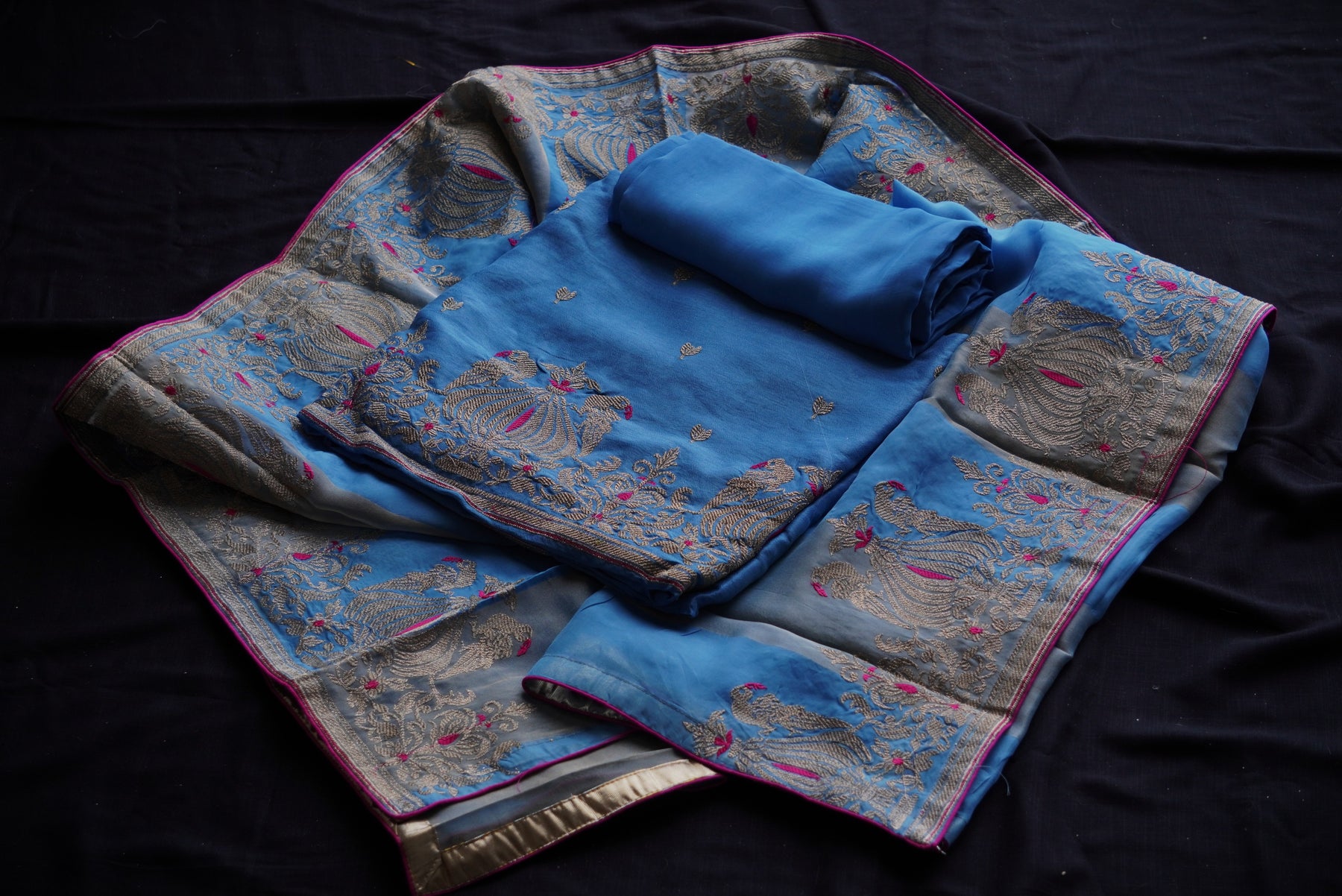 Base Fabric: Soft sky-blue organza fabric with a subtle sheen.