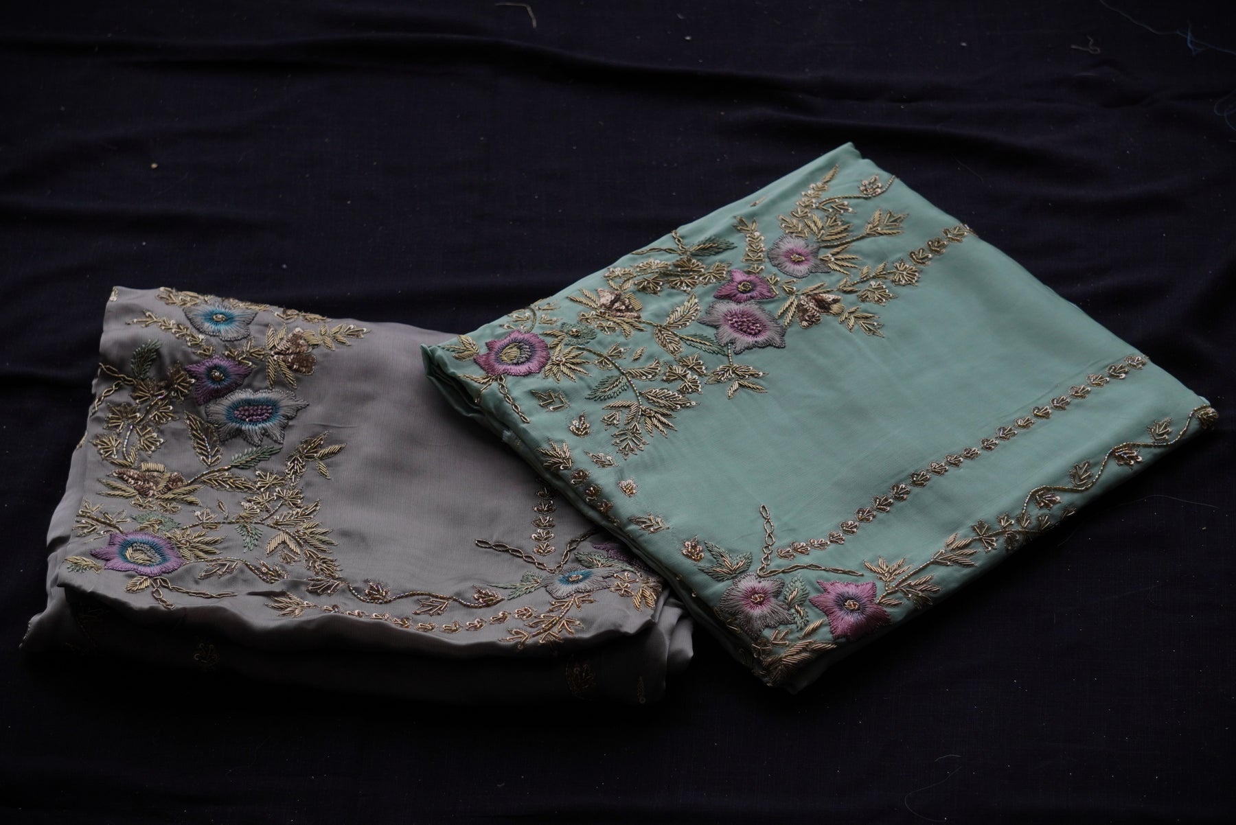 Flowers are highlighted with thread detailing and subtle sequins, adding a touch of shimmer.