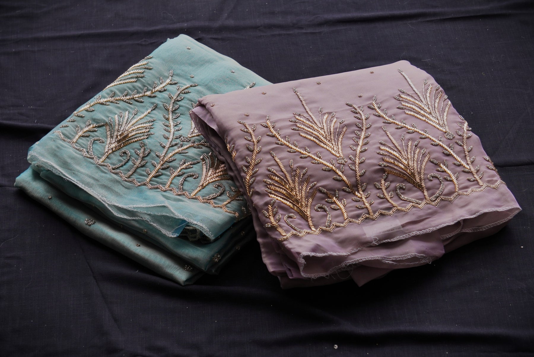 The border/hemline is heavily embroidered with dense golden threadwork.