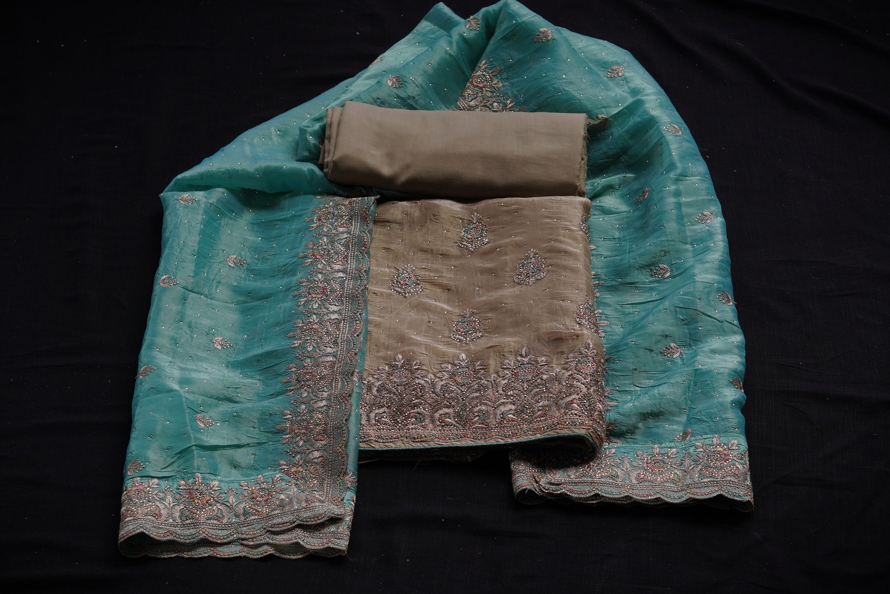 Zardozi-inspired embroidery with zari (gold/silver threads), sequins, and beadwork. Embroidery looks denser and more ornate than the previous pink set. Beige kurta: Small, butis (floral motifs) scattered all over, with a heavy embroidered border at the hem. Metallic gold/silver threads with accents of green and pink, blending with the base.